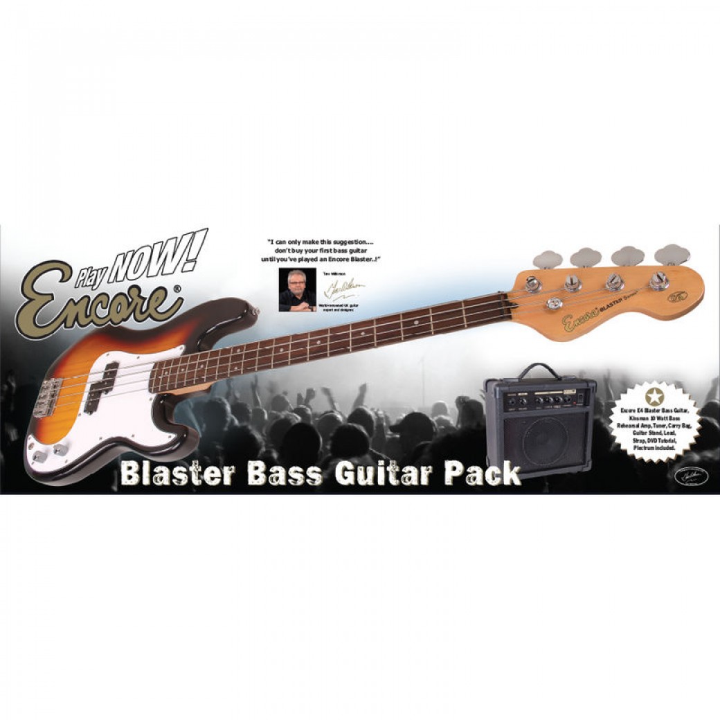 All you need to start playing. Pack includes Encore E40 bass guitar in a choice of colours (vintage white, sunburst and black), 20W amplifier, lead, strap,clip on tuner, carry bag, spare strings and bass pick.